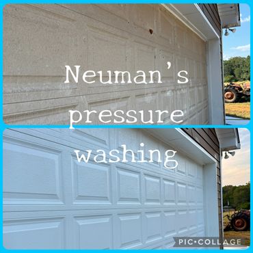 Before and after of a tall vinyl-sided house wall cleaned with pressure washing, removing dirt and m